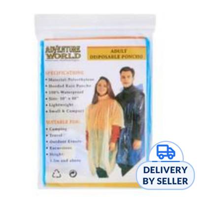 Sometimes, an umbrella just isn't waterproof enough. Ideal for one-time camping trips and travels, the disposable poncho is a cheap but worthy option for full-body rain protection. Size: 50" x 80". Material: Fabric Polyethylene. Colors: Blue. Packing: 5pcs.