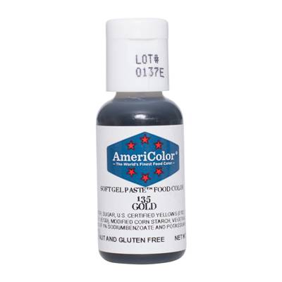 AmeriColor Soft Gel Paste color in Gold is the first choice of top decorators worldwide. With more than 50 colors to chose from, AmeriColor has the perfect color for your project, with deep, vivid colors that have no aftertaste. AmeriColor Soft Gel Pastewill color royal icing, buttercream, rolled fondant, macarons, cookie dough, bread dough, cake batter, whipped toppings & icings, gum paste, marzipan, pastillage and white chocolate (with addition of Flo-Coat). Soft Gel Pasteis peanut, tree nut, soy, and gluten free. Need to get the same shade every time you decorate? AmeriColor squeeze bottles with flip-top caps allow you to precisely measure your color drop by drop, giving you the same results every time.