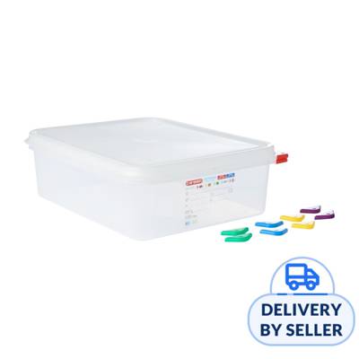 A durable and hygienic storage solution for every kitchen. Made of high quality BPA-Free Polypropylene that can be used to store foods at temperatures ranging from -40 to 95?C. Container includes a permanent label integrated into the wall and will not peel off. Use the Araven Horeca Marker Pen to record information like type of content and date of origin. Cover has a double airtight seal for total protection of food and to lock in the freshness for a longer period of time. Resistant to normal dishwashing chemicals and washable even in a dishwasher. Four colour clips are included to prevent cross-contamination. Dimensions are 325 x 265 x 100mm and capacity of 6,5 litre. Product is NSF certified and manufactured in Spain.
