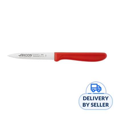 ARCOS range of Peeling and Paring knives are ideal for peeling and cutting fruits and small vegetables. The NITRIUM Stainless Steel blade provides additional hardness, greater cutting power and improved cutting edge durability, compared with conventional Stainless Steel. A serrated edge makes it easier for cutting foods like tomatoes and sausages. The handle is made of lightweight Polypropylene and is durable, hygienic, resistant to impact, abrasion, and solvents, and is dishwasher safe. Product is manufactured in Spain.
