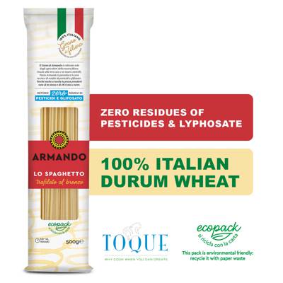 Pasta Armando is made only with 100% Italian Durum Wheat; cultivated as part of direct supply chain. The Armando supply chain is based on strict cultivation protocol and selected varieties of durum wheat, using agricultural techniques that guarantee the production of healthy raw material of excellent quality. The first Pasta Chain in Italy, Unique because Armando signs a direct agreement with every single farmer in the supply chain A cultivation protocol that promotes good agronomic practices A premium pasta, from 100% Italian wheat, with high protein content, gourmet and very high organoleptic performance The Unique Pasta with Zero Pesticide - Zero Glyphosate certification ECOPACK: Fully Recyclable Packaging SPAGHETTO Bronze extruded. Its name comes from the fact that it has a similar size to thin string. Simple and light. Excellent with vegetables and aromatic herbs.