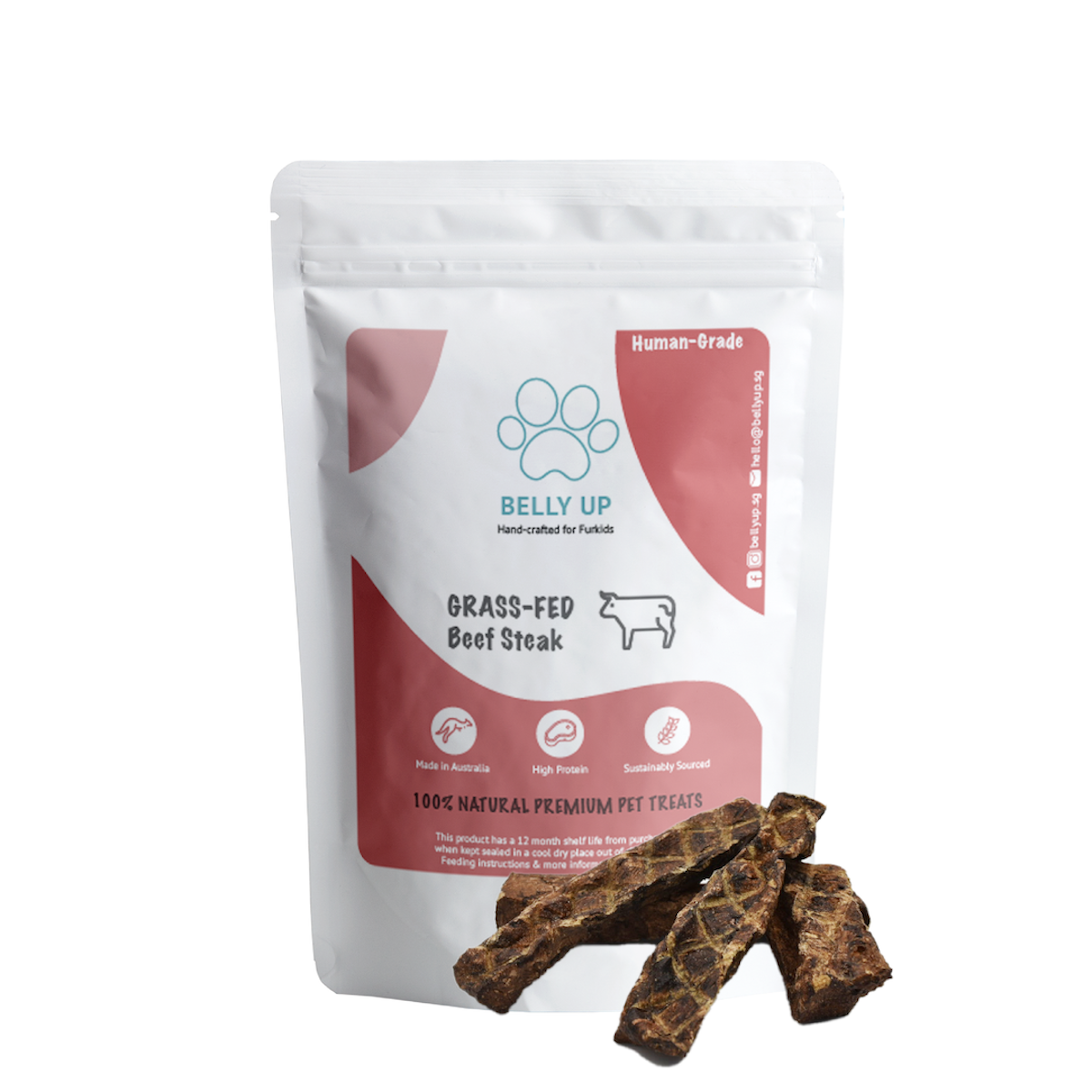 BELLY UP 100% Natural Australian Grass-Fed Beef Steak is high in protein and essential nutrients such as iron, zinc, vitamin E, vitamin B12, and carotenoids. It is the perfect training treat providing high-quality rewards for your pup.