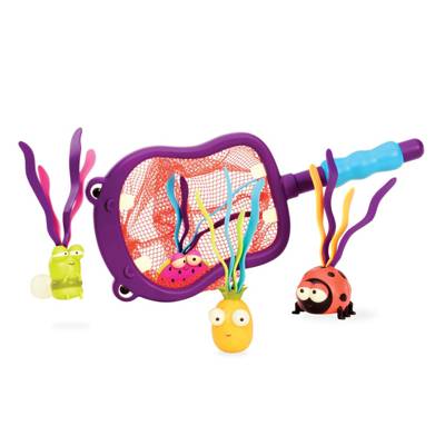 Toss the weighted snacks into the pool and watch them sink. Dive down to scoop the critters up with the net as fast as you can. An easy-grip handle means no dropping in deep or shallow seas. Suitable for 3 to 8 years Comes with: 1 net & 4 diving pieces