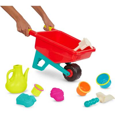- This play set comes with a wheelbarrow, watering can, shovel, rake, 2 sand molds, and 3 nesting cups.