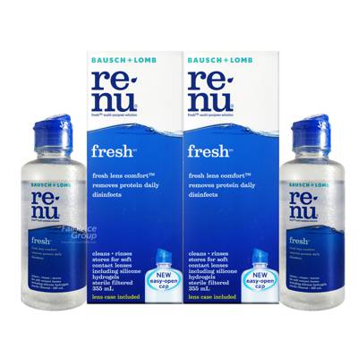 Renu Fresh Multi-Purpose Solution cleans, loosens and removes accumulations of film, protein, other deposits and debris from soft contact lenses. It removes protein most effectively when used daily and destroys harmful microorganisms on the surface of the lens. Rinses, stores and wets lenses before insertion. All in one bottle – Renu.