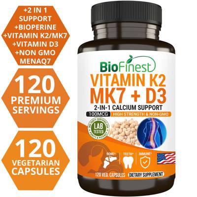 Biofinest Vitamin K2 (MK7) with D3 Supplement - Vitamin D & K Complex - 25 mcg Vitamin D3 & 100 mcg Vitamin K2 MK-7 - Bone Teeth Muscle Joint Heart Immune Support and Calcium Absorption - Black Pepper Extract Fast Absorption (120 Vegetarian Capsules). EXTRA STRENGTH 2-IN-1 FORMULA: Vitamins D3 & K2 were simply meant to be together. Most people know the benefits of Vitamin D (maintaining strong bones, immune system support, healthy muscle function, etc.), but many don’t realize that Vitamin D NEEDS Vitamin K2 to maximize its benefits. So, if you’re fighting Vitamin D deficiency, you need to supplement Vitamin K2 as well. Biofinest’s D3 + K2 has you covered, adding just the right amount of each Vitamin’s superior form for maximum results. The perfect pair work together to fight vitamin D deficiency and maximize each other`s benefits.