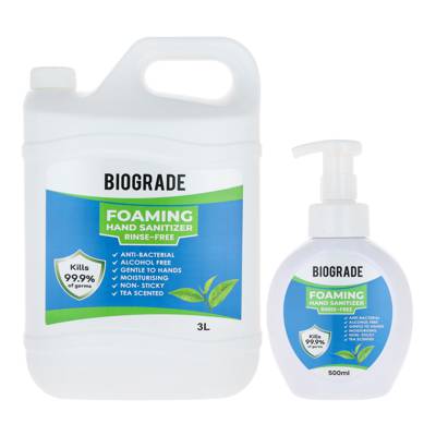 Kills 99.9% of germs and harmful bacteria. Enriched with moituriser to protect hands; suitable for dry or sensitive skin. Rinse-free and non-sticky. Rich foam with a pleasant tea scent. Bundle includes 1 x Foaming Hand Sanitizer 3L and 1 x Foaming Hand Sanitizer 500ml.