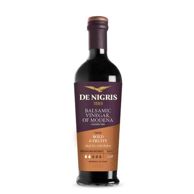 Bold and fruity. Contains 35% cooked grape must, this premium balsamic vinegar of Modena is 100% natural and authentic. It has a delightful smooth fruity taste with a slight hint of oak. Perfect for cold dishes and as a dip for appetisers. Ideal for salads, roast potatoes and any roast vegetables.
