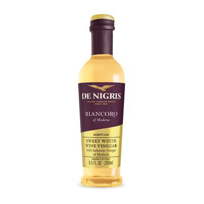 Added with grape must, the white balsamic vinegar is naturally sweeter that white vinegar. and makes a perfect complement to meat, poultry, and fish. It is great for deglazing for sauces and dressings where a lighter color is preferred to preserve appearance without sacrificing flavor. Perfect for your salads, desserts and sauces. Low in Acidity