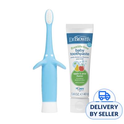 Establish good oral hygiene habits with baby with Dr. Brown?s Infant-to-Toddler Toothbrush. The toothbrush is sized just right for small mouths and little fingers ? helping baby build the skills they need to reach independent brushing. Super-soft bristles safely and gently clean baby?s first teeth and gums while the durable, yet soft material of the brush is gentle on sensitive mouths. The fluoride-free toothpaste is the perfect first step for growing mouths to help baby learn good dental hygiene. Help your tot build the skills they need to learn independent brushing. Just add a pea-sized drop to a super-soft bristled toothbrush and use small circular motions to gently clean their teeth and gums. Safe to swallow. Always use with adult supervision. Keep away from dogs. Contents: Toothbrush x 1, Toothpaste x 1