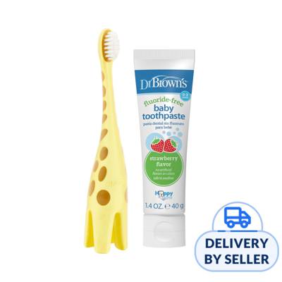Establish good oral hygiene habits with baby with Dr. Brown’s Infant-to-Toddler Toothbrush. The toothbrush is sized just right for small mouths and little fingers – helping baby build the skills they need to reach independent brushing. Super-soft bristles safely and gently clean baby’s first teeth and gums while the durable, yet soft material of the brush is gentle on sensitive mouths. The fluoride-free toothpaste is the perfect first step for growing mouths to help baby learn good dental hygiene. Help your tot build the skills they need to learn independent brushing. Just add a pea-sized drop to a super-soft bristled toothbrush and use small circular motions to gently clean their teeth and gums. Safe to swallow. Always use with adult supervision. Keep away from dogs. Contents: Toothbrush x 1, Toothpaste x 1