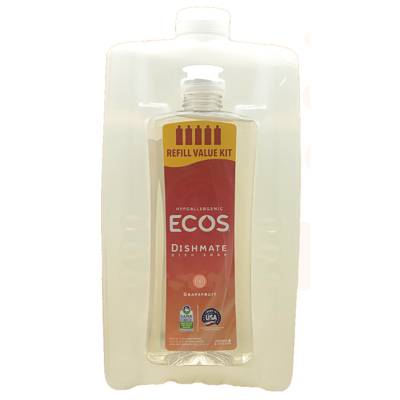 - ECOS Dishmate Grapefruit Dish Soap uses the power of plants to cut through even the toughest grease and food residue. Our hypoallergenic formula is gentle on your hands and uses ingredients that are safer for you and the environment. This innovative bulk packaging contains 4x refills and is designed to snap together to eliminate the need for shrink wrap and to help reduce plastic waste.