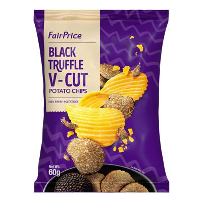 Enjoy more crunch and flavour with FairPrice Black Truffle V-cut Potato Chips. Made from 100% fresh potatoes with ridges, each chip delivers a savoury flavour for mouthwatering satisfaction!