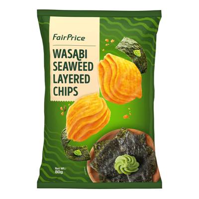 Enjoy the crunch and bold flavours of FairPrice Wasabi Seaweed Layered Chips with aromatic wasabi and umami seaweed flavour. You'll keep coming back for more!
