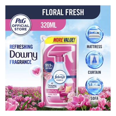 Febreze with Ambi Pur fabric refresher eliminates odours and 99% of odour-causing bacteria, leaving fresh Downy scent.