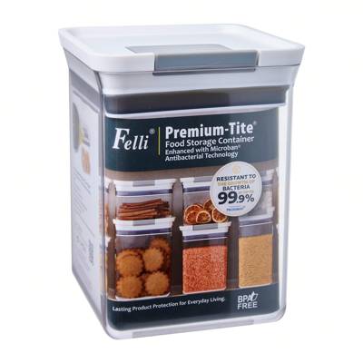 Premium Tite Food Storage Container Enhanced with Microban Antibacterial Technology. Size: 13.9 x13.9 x 18cm. Capacity: 1.8L. Benefits: 1. Resistant to the growth of bacterial that can cause staining, bad odors and premature degradation. 2. Have an extended funactional lifetime. 3. Contain a food contact approved antimicrobial technology that will not wash off or leach out. 4. Remain cleaner and fresher in-between cleanings, offering an added level of cleanliness protection between normal cleaning routines. 5. Contain a technology that has undergone extensive independent laboratory testing and has a long history of safe use. Microban Antibacterial Technology will remain active 24/7 and for the expected lifetime of the container, allowing you to worry less and enjoy life more. Features: Easy open flip-buckle lid; Food grade safe silicone seal; stackabel for space saving organization; High quality BPA-free acrylic resin; Dishwasher & freezer safe.