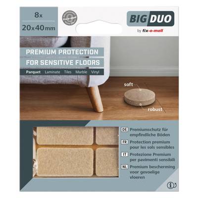 With these PREMIUM parquet gliders, chairs, armchairs or tables can be moved gently, quietly and without damaging the floor surfaces. This naturally also applies to exclusive tiles and laminates. The special material combination of soft sliding layer, firm stabilising layer and very strong adhesive provides optimum protection. This guarantees high wear and abrasion resistance and a long service life for the BIGDUO parquet glides.