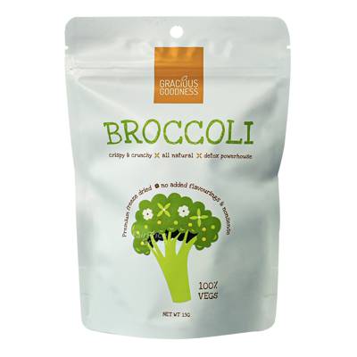 100% freeze-dried broccoli florets. Great vegetable snacks for kids and adults! No oil, no added sugar and preservatives. It is also great for quick-and-easy cooking at home. Add to salads, soups, stews and juices for an extra healthy crunch!