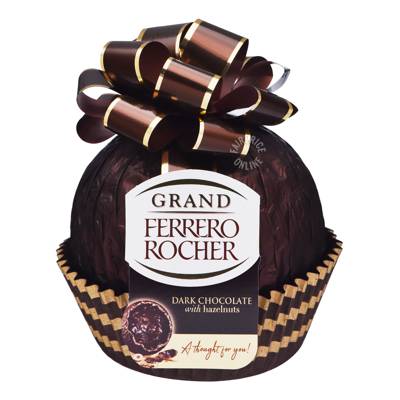 This Holiday, show your appreciation with Grand Ferrero Rocher. Gift a friend or family member with this exquisite dark chocolate hollow ornament with hazelnut pieces. Its delightful wrapping with the decorative bow and the iconic "pirottino" paper cup adds a perfect celebratory touch of elegance to the gift, because festive moments deserve to be celebrated with something special.