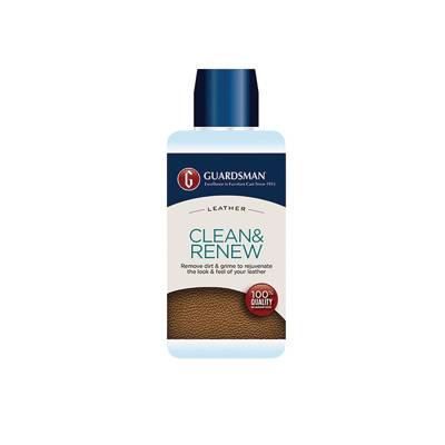 Guardsman Leather Clean & Renew rejuvenates leathers appearance, gently yet thoroughly removing soil and grime. Leather and vinyl enjoy a renewed look and feel. Guardsman Leather Clean & Renew is pH balanced to maintain leathers soft, supple feel. Our streak-free cleaning product leaves no dust-sticking residue common with all-in-one cleaners. Product Description - pH balanced to maintain leathers soft, supple feel - Streak-free clean leaving no dust-sticking residue common among all-in-one cleaner conditioners - Keeps leathers intended sheen; free of oily gloss - Safe for use on aniline leather. Not intended for use on suede and nubuck leathers Made exclusively for Guardsman in Italy by a world leader in leather finishing technology Guardsman Clean & Renew 250ml For best results and long-lasting beauty, use Guardsman Leather Cleaner at least 6-12 times per year. Always follow up with Guardsman Leather Protect & Preserve to create an invisible shield against premature aging and damaging stains.
