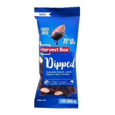 Take your time to truly indulge with Dipped. These roasted Australian almonds are very lightly dipped in dark chocolate, creating a crisp, dark shell with 70% less sugar than traditional chocolate-coated nuts - so you can enjoy them with peace of mind and mouth...