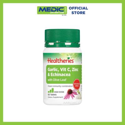 Healtheries Garlic, Vitamin C, Zinc and Echinacea with Olive Leaf is formulated specifically to build up your immunity. This powerful immunity-protecting natural remedy that's ideal if you can't afford to get sick over Winter; Combines odorless Garlic with Vitamin C, Zinc, Echinacea and Olive Leaf to give your immune system a helping hand; Specifically created to help protect you and your family from wintertime coughs, colds and flu. And because the garlics odourless, your breath stays fresh too. Contains no wheat, gluten, milk derivatives, soy, yeast, sugar, corn, starch, colour, flavour or preservatives.
