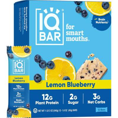 IQBAR low carb protein bars are made using simple ingredients + 6 amazing brain nutrients. These keto snack bars are designed to keep you full, focused & energized throughout the day. They contain 12g plant-based protein, <1-1g sugar, & only 3g net carbs per bar. IQBARs are vegan, keto, dairy-free, soy-free, kosher & high in fiber. Made using clean-label ingredients that are packed with compounds for both your brain and body. IQBAR's 6 brain nutritents included in each bar are: Lions Mane, MCTs, Omega 3, Flavonoids, Vitamin E & Choline. This Lemon Blueberry bar tastes like a refreshing, puckery, full-bodied lemon dessert, but spares you the crash you would expect from a typical treat. We incorporate real, whole lemons into this bar to give you a true-to-nature eating experience.