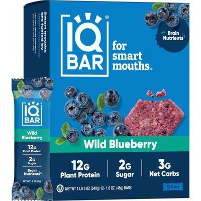 IQBAR low carb protein bars are made using simple ingredients + 6 amazing brain nutrients. These keto snack bars are designed to keep you full, focused & energized throughout the day. They contain 12g plant-based protein, <1-1g sugar, & only 3g net carbs per bar. IQBARs are vegan, keto, dairy-free, soy-free, kosher & high in fiber. Made using clean-label ingredients that are packed with compounds for both your brain and body. IQBAR's 6 brain nutrients included in each bar are: Lions Mane, MCTs, Omega 3, Flavonoids, Vitamin E & Choline. This Wild Blueberry bar is packed with real wild blueberries that deliver a fresh, 100% natural taste. If youve ever enjoyed wild blueberries on a hike or elsewhere in nature, this bar will really hit home for you. Perfect as a breakfast snack or an afternoon pick-me up!