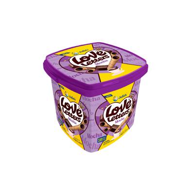 Julie's Love Letters Mocha are crispy wafer rolls filled with a rich mocha-flavored cream, blending chocolate and coffee for a sweet, indulgent snack.