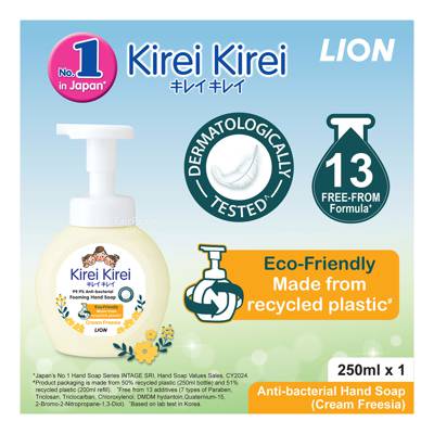 - Kirei Kirei Anti-bacterial Foaming Hand Soap (Cream Freesia) is made from recycled plastics^. It is dermatologically tested to be gentle on delicate skin and is free from 13 additives*. It provides rich creamy foam with 99.9% anti-bacterial protection to help clean all parts of hands more thoroughly, yet being gentle on skin.