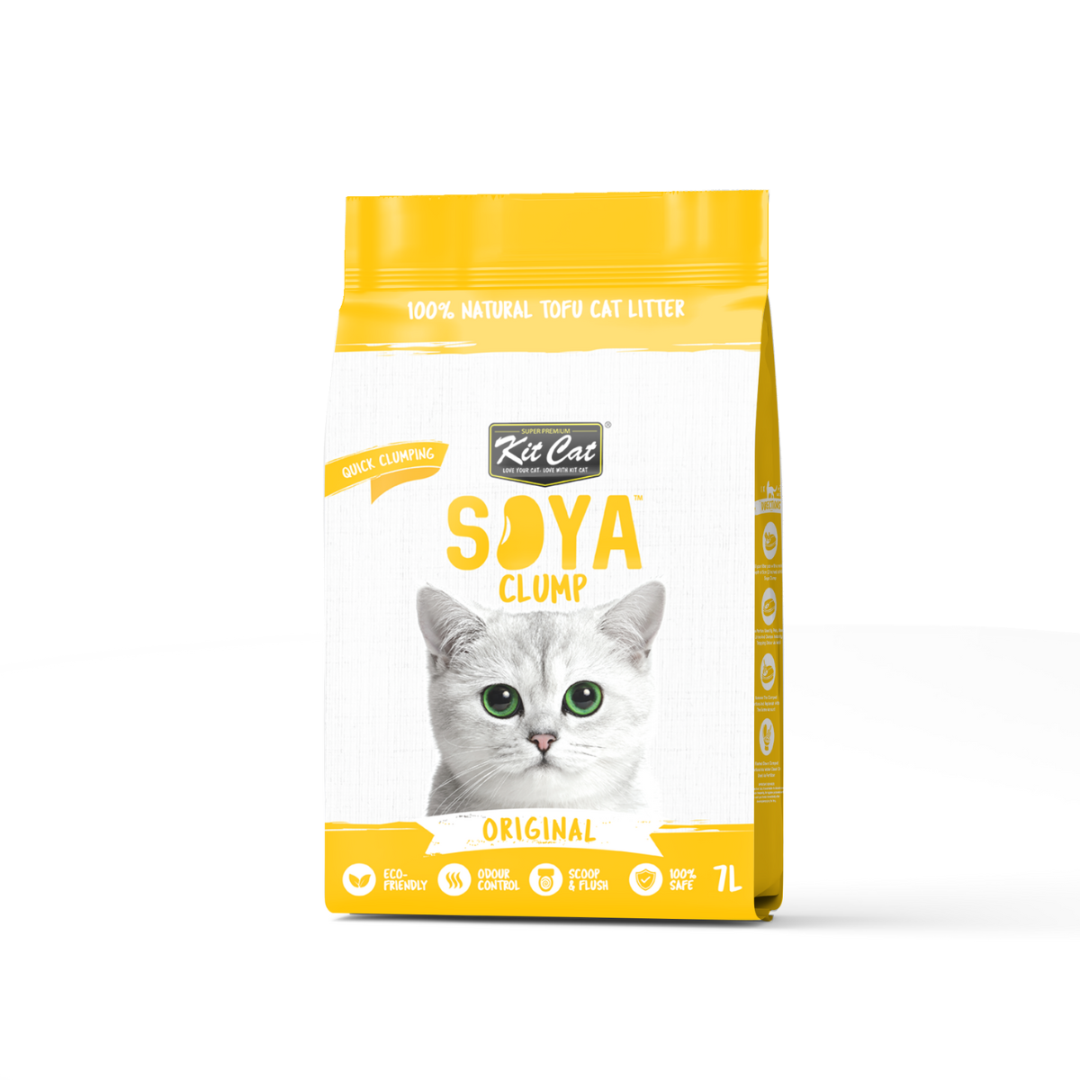 100% biodegradable soy-based cat litter with mild aroma ; made from the insoluble parts of a soybean which is found in soymilk production ; Normally these insoluble parts are mainly disposed in a landfill, but Kit Cat innovates a second purpose for this wasted material to be used as cat litter, labeling us as Eco-Friendly.