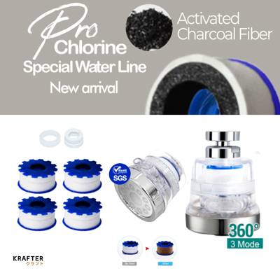 Name : 360Faucet 3 Mode Water tap pro Chlorine filter Set Works well with dual basin sinks. Certified SGS / ROHS /FDA Food Grade Stainless Steel Tested water saving up to 75% 3 mode Rotation Faucet provides option of normal pressure water stream. Easy to clean, use mild soap to ensure non-tarnish shine. Smooth and Refined Turning mechanism to bring comfort in handling. Material : ABS +Full Stainless Steel (38g) Colour : Glacier (Transparent) Refill Pack for V4 (4pcs) Each set of contents: Krafter 360 Filter Faucet V4 x 1pcs , Refill Filter V4 x 4pcs