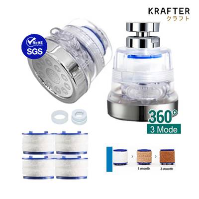 Name : New Cobra Pure Filter Set Works well with dual basin sinks. Certified SGS / ROHS /FDA Food Grade Stainless Steel Tested water saving up to 75% 3 mode Rotation Faucet provides option of normal pressure water stream. Easy to clean, use mild soap to ensure non-tarnish shine. Smooth and Refined Turning mechanism to bring comfort in handling. Material : ABS +Full Stainless Steel (38g) Colour : Glacier (Transparent) Refill Pack for V4 (4pcs) Each set of contents: Krafter 360 Filter Faucet V4 x 1pcs , Refill Filter V4 x 4pcs