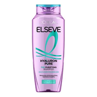 - Our NEW L'Oréal Paris Elseve Hyaluron Pure 72H Purifying Shampoo balances your hair's ideal moisture level for soft, smooth and shiny hair*. It is enriched with [Hyaluronic acid + Salicylic acid], that purifies the scalp by removing oil & impurities. It also provides deep hydration to the hair, nourishing it from the roots to the ends.