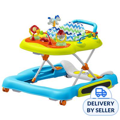 The versatile design can be configured into 5 modes of enjoyment allowing it to adjust to match your child's developmental milestones- Rocker for the initial months / Walker when your child learns to walk/ 360 Activity Centre with Jumper Board promote child development / Musical Foot Board / Pusher. Stimulate your childs senses with the toys on the activity tray as he or she explores the space around them. Removable the activity tray & perfect for snacks time. Height positions allow you to adjust the fit for your child as he or she grows. Washable seat cushion - High backing for better support. Wide base for more stability and secure your baby better. Compact folding, making it easy to tuck away when not in use. Sturdy wheels, your child can move equally well on either carpeted or bare floors - Safety stopper prevents the wheels from catching on uneven surfaces/Prevent accidental fall on stairs. Make your child's first steps fun and easy with Jamboree 5 In 1 Multi-Functional Baby Wa