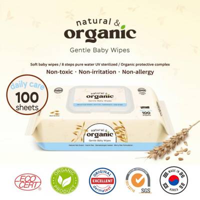 The new Natural & Organic baby wipes, carefully formulated with organic extracts to cleanse and soften you and your babys skin. Safe to use for sensitive skin. Use it every day on the babys delicate skin, face, mouth, and bottom for a cleaner, fresher, and smoother skin. Suitable for newborns, babies, toddlers, sensitive skins, and safe for hand, mouth and utensils. - Natural and Organic ingredients - EWG Skin Deep Green Grade ingredients - Unscented - Free of toxic material for your skin - Alcohol Free - 8-steps purified water - Soft Touch Plain Fabric - Infant-friendly product - Allergy-friendly - Easy one-hand system (one sheet per pull) - Antibacterial packaging - Premium quality safe baby wipes - Sheet dimension : 150 x 200 mm (+/- 5mm), 350g - Plain type with anti bacterial CAP - 100 sheets per packs - Made in Korea Why Natural & Organic Baby wipes? * It is unscented and using8-steps purified water. *It is a non-toxic baby wipesas all ingredients areEWG Skin Deep Green Grade. * It is a product certified as non-irritating baby wipes withSoft Touch Plain Fabric. *Newborn babies can also use it because it was certified as baby wipes for infants and toddlers after passing a rigorous testing on safety. * Don't have to worry about harmful bacteriaas it uses 99.9% antibacterial certified safepackages.