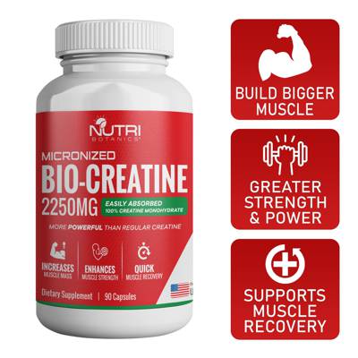 Nutri Botanics Micronized Bio Creatine Monohydrate 2250mg comes in convenient, easy to swallow capsules to increase muscle mass and muscle recovery, while enhancing muscle strength. Effects are visible as fast as 14 days!