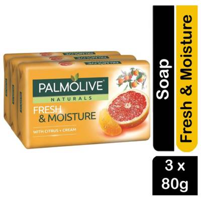 Palmolive Naturals Fresh & Moisture Bar Soap with citrus and cream pampers your skin with rich moisturising cream and 100% natural citrus essences. Lather all over the body for radiant; invigorated skin. With rich moisturising cream and 100% natural citrus essences. Radiant and invigorated skin.