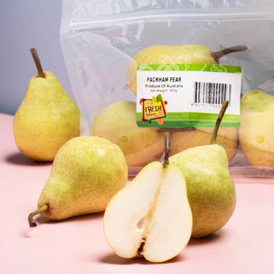 - • A fruit with a wide bottom, the Packham pear is green with dark spots on the skin.