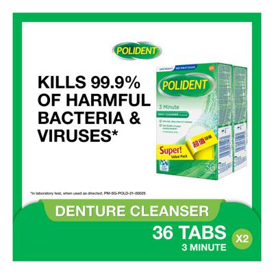 - 1. Drop one Polident tablet into enough very warm water (not hot) to cover denture or partial
