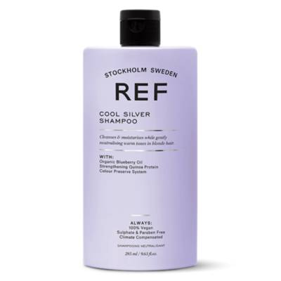 REF Cool Silver Shampoo (285ml) is a sulphate-free shampoo formulated with botanical extracts and violet pigments chosen to protect, strengthen and neutralise unwanted yellow/brassy tones. The formulation also includes strengthening Quinoa Protein & organic Blueberry Oil to protect against colour fading. Adds a hint of silver to grey hair. Cruelty-free and vegan-friendly.