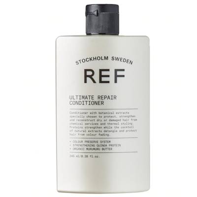REF Ultimate Repair Conditioner (245ml) is a reconstructing, strengthening conditioner for use on dry, damaged hair. Natural Quinoa Protein combines with organic Murumuru Butter to strengthen and protect the hair structure, sealing in hydration for increased volume. Containing Sunflower Seed Extracts, the formula boosts density and shine while repairing chemical and thermal damage. Long-lasting colour depth and intensity is ensured by the REF Colour Preserve System. Cruelty-free and vegan-friendly.
