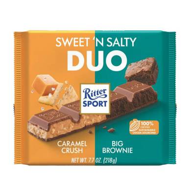 Discover the delicious taste of Ritter Sport Chocolate Sweet`n Salty Duo! With 2 different varieties in one bar, this delicious chocolate offers an incomparable taste explosion:CARAMEL CRUSH: Milk chocolate filled with delicious caramel cream and salty butter biscuit pieces. And BIG BROWNIE: milk chocolate filled with full-bodied brownie cocoa cream.