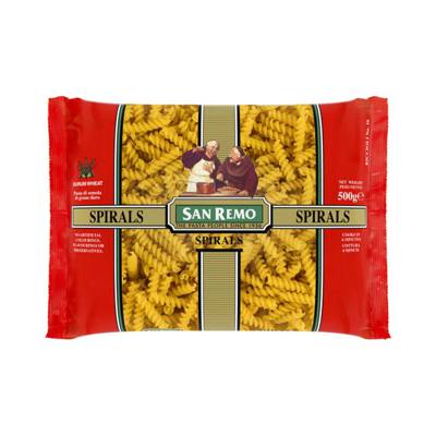 San Remo Spiralsis made of 100% durum wheat semolina flour and cooks in just 8 minutes, and is free of all artificial colourings, flavourings, and preservatives.