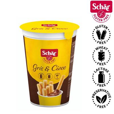 Dr Schar Milly Gris And Chiocc! Italian gluten free breadsticks with a light cocoa dipping sace ina practical portion cup! Dip away!!! Gluten free, wheat free, lactose free, preservative free, palm oil free.