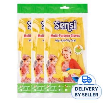 SENSI Multi-Purpose Gloves have excellent physical strength, designed for application in senatorial activities, food processing and household cleaning. Excellent chemical resistance to acids, alkalis, detergents and alcohols. The chlorinated powder-free treatment minimizes particle contamination. Features: Natural Latex. Anti-Slip. Pattern Grip. Superior Textured Grip. Extra Protection. 1 pair per pack 3 pairs bundle Available size in S/ M/ L