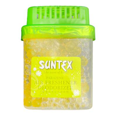 Air freshener formulated with essential oils and deodorant, absorbed by gel beads.