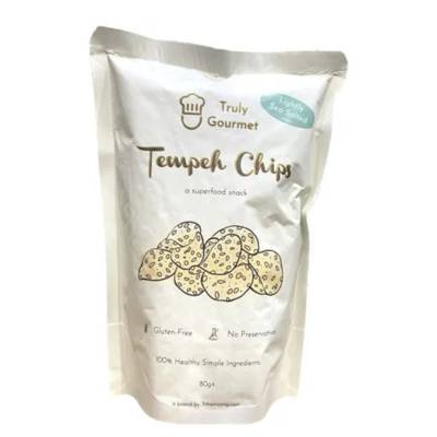 Truly Gourmet Tempeh Chips are made by fermenting a combination of soybeans, gluten-free flour and starter. The gluten-free flour allows for more space in between each soybean resulting in a much milder tempeh flavor. Importer: Super Belgian Pte Ltd, 14 Wholesale Centre #01-26, Singapore (110014)