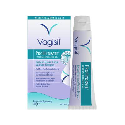 Vagisil Prohydrate External Hydrating Gel instantly relieves vaginal dryness for more comfortable intimacy and restored confidence. Contains ProHydrate Complex, a unique blend of moisturises including Hyaluronic Acid that mimics a womans own natural moisture. Leaves intimate skin feeling hydrated, supple and more comfortable during intimacy.