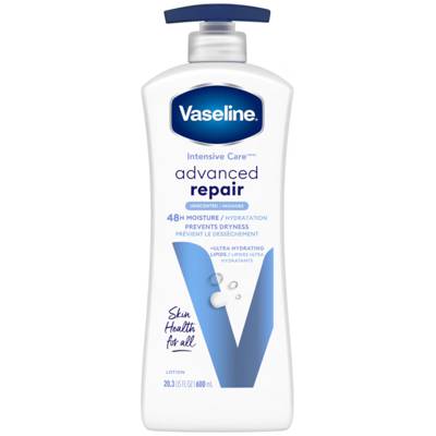 Vaseline Intensive Care Advanced Repair Unscented Body Lotion moisturizes dry skin. Vaseline Advanced Repair Body Lotion can moisturize and repair stubborn dry skin. Contains microdroplets of Vaseline Jelly to lock in moisture. Deeply moisturizes to heal dry skin in 5 days. Daily body lotion best for: dry skin, sensitive skin, dry irritated skin